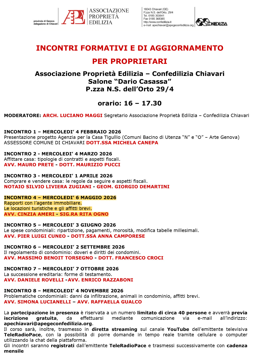 Incontri formativi e di aggiornamento per proprietari – Rapporti con l’agente immobiliare. Le locazioni turistiche e gli affitti brevi
